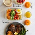 - Lunch: Cook quinoa and eggs, add half of quinoa and one egg to sealable lunch container, top with julienned carrot, sliced cucumber, and tomatoes. Add lemon juice, olive oil, sea salt and pepper to a sealable jar and shake to combine. Add dressing on lunch bowl minutes before eating.