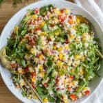 - Season – I recommend seasoning the salad first BEFORE adding the arugula to avoid having the arugula flying all over the place when mixing the seasoning. Add sea salt and pepper to taste, 1/4 to 1/3 cup of extra virgin olive oil, and plenty of lime juice. I used three very juicy limes, but adjust the number to your taste and how juicy your limes are. Give it a good stir to mix it all up.