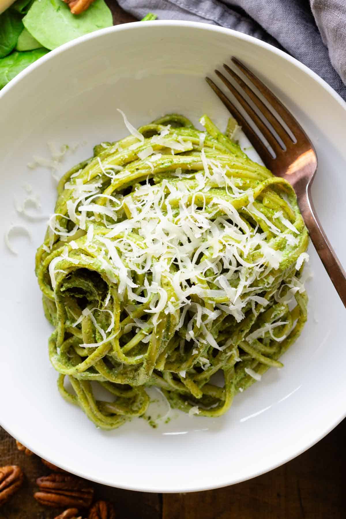 - Add the sautéd ingredients, rest of the basil, pecans, cheeses, olive oil, and milk to a blender and blend until smooth. The sauce should be thick but pourable. If it's not pourable add another splash of milk.