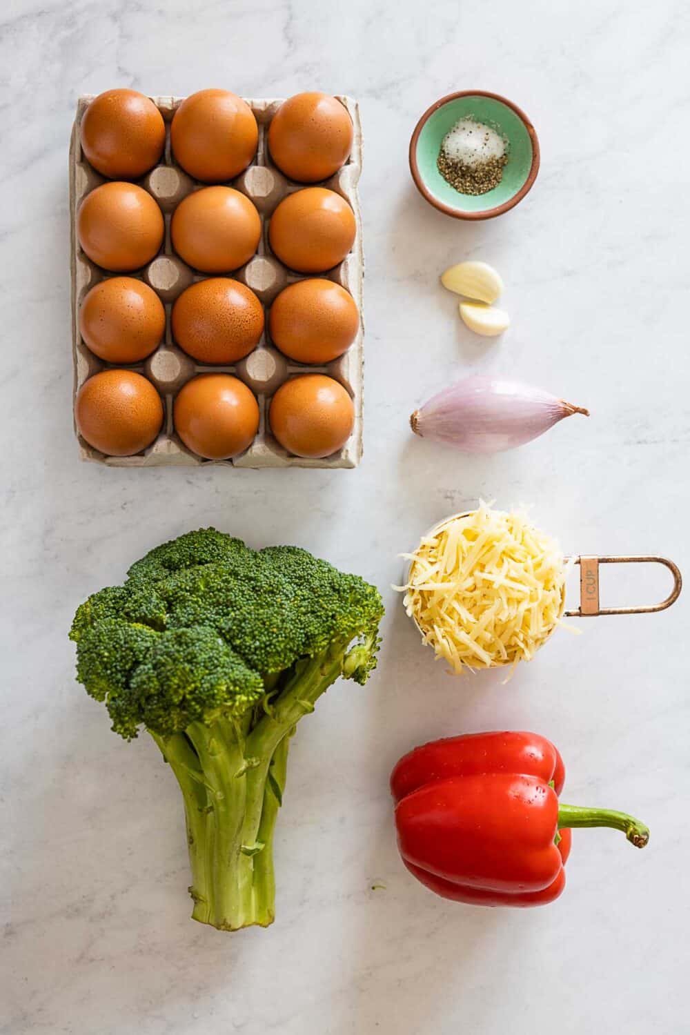 - Veggies — the sky is the limit of course but you’ll want about 4-5 cups in volume of veggies for 12 eggs. You will also want to use vegetables that have similar cooking times to ensure they cook evenly.