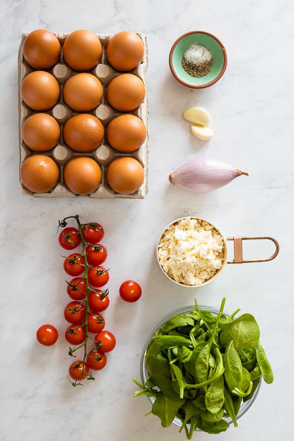 - Eggs — for a 9-inch pan you will need 12 eggs. If your pan is smaller or larger you might have to adjust the number of eggs to ensure you’re frittata doesn’t turn out all flat.